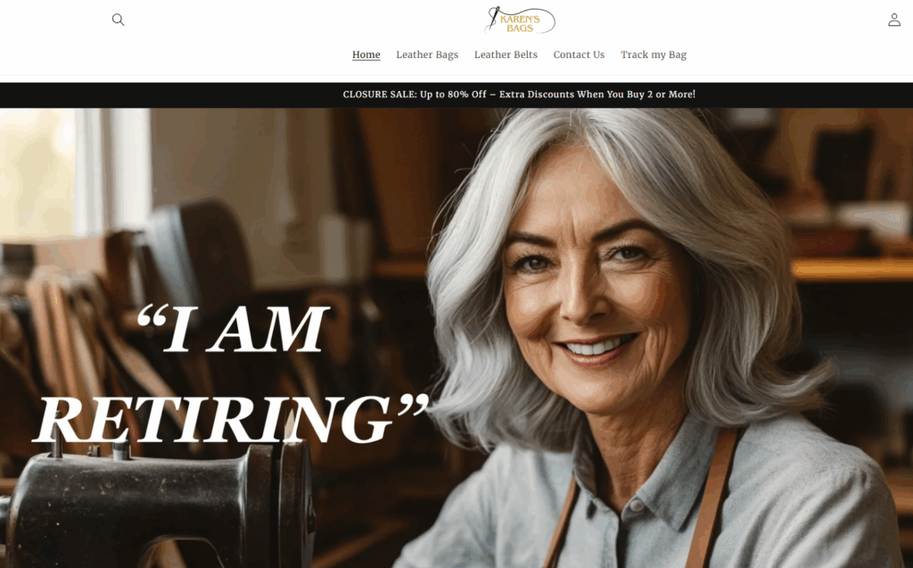 On the surface, karen bags.com positions itself as a fashion e-commerce site offering handcrafted leather handbags, based on the emotional narrative of a craftsman named “karen”, who sells her lifetime quality works at extremely low discounts (up to 80% off) upon her retirement. Its homepage is very exquisite, claiming a lifetime craftsmanship guarantee and a generous return policy.